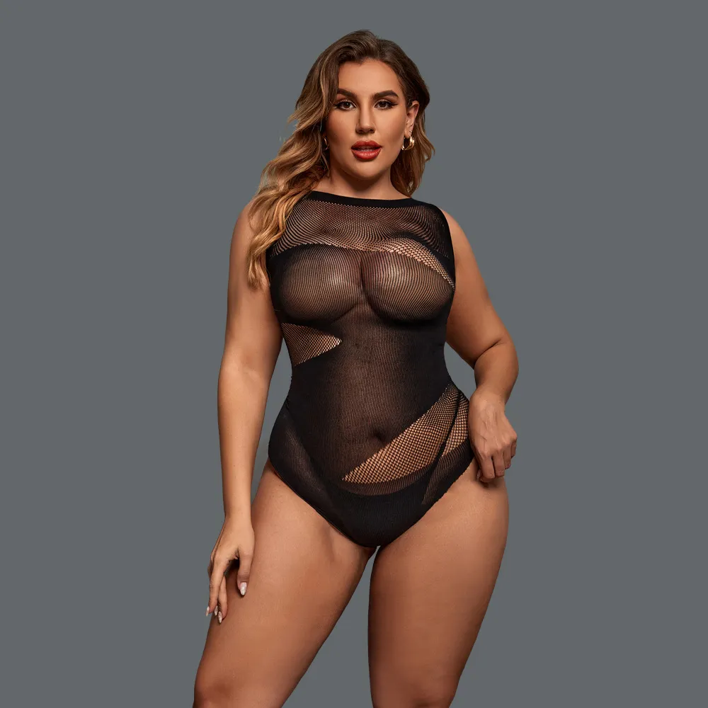 Women’s Fashion Plus Size Sexy Hollow Perspective Bodysuit, a sultry and sophisticated choice for bold self-expression: