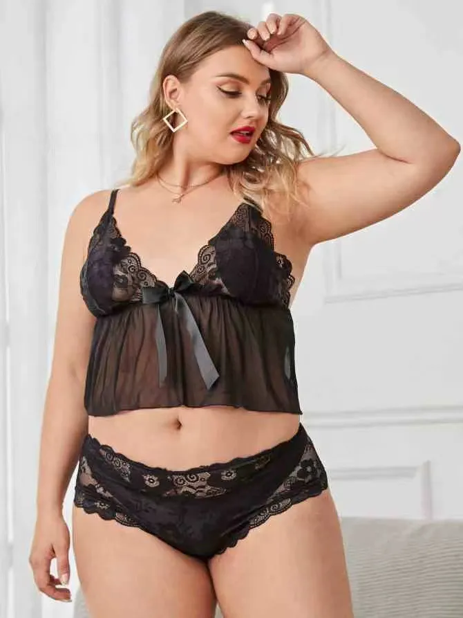 Plus Size Lace Mesh Deep V Sheer Sling Lingerie Set