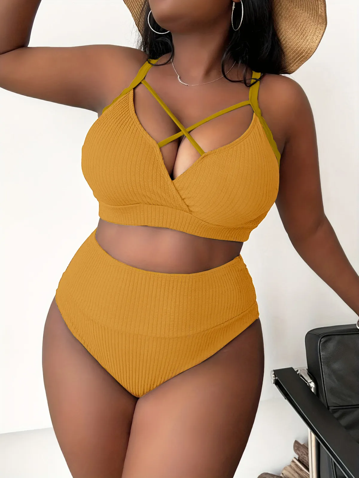 Summer Women Fashion Sexy Plus Size Solid Color Cross Hollow Sling High Waist Swimsuit Set